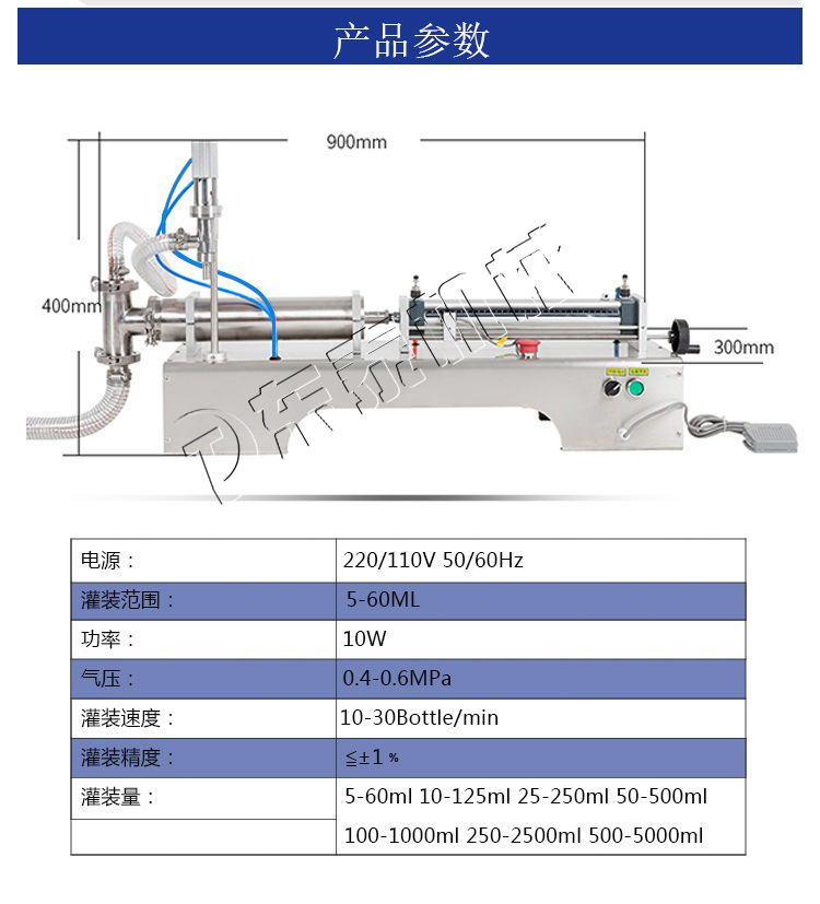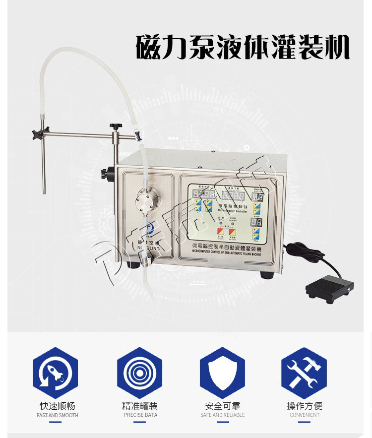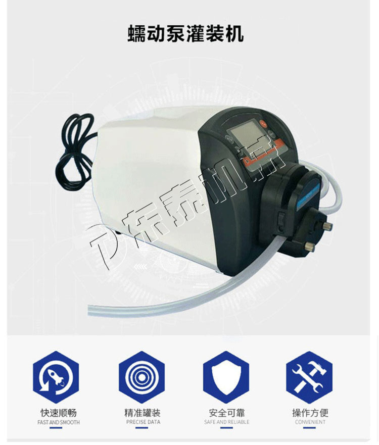 可灌充絕大類型的液體,包括高粘稠度的液體。如:各種藥劑、化學品、油類、化妝品、食品等無顆粒狀液體;灌裝精度高,適合實驗室用。