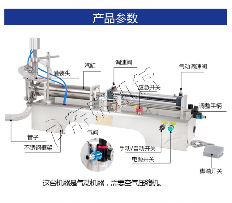 小型液體定量灌裝機,通過氣缸帶動一個活塞來抽取和打出物料,用單項閥控制物料流向,小型液體定量灌裝機用磁簧開關控制氣缸的行程,即可調節灌裝量。